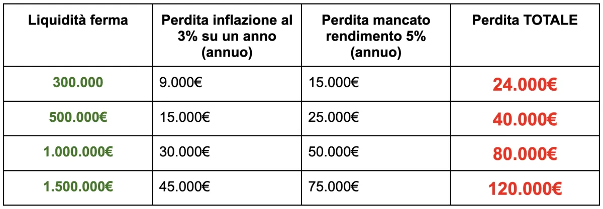 Ecco che per esempio se hai 500.000€ nel tuo conto, puoi subire una perdita annua dell'8%, ovvero 40.000€ solo tra mancato rendimento e il caro prezzo dell’inflazione.